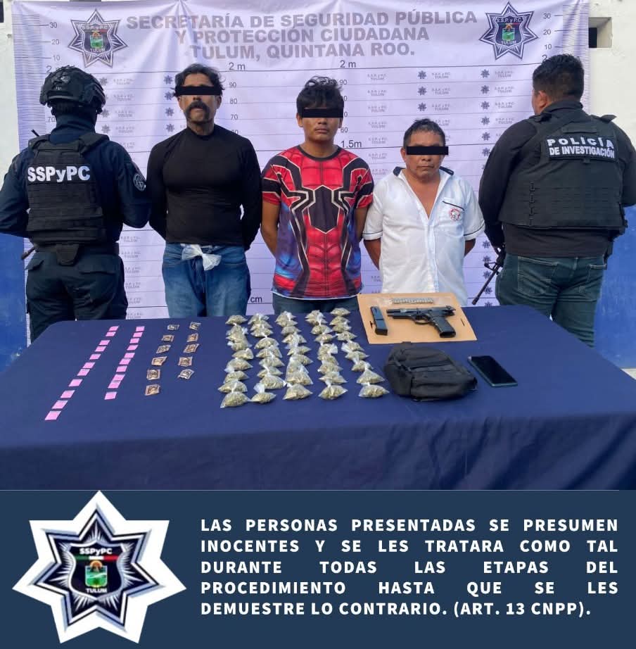 Los asegurados fueron identificados como Jorge Alexander “N”, de 18 años; Julio César “N”, de 41 años; y Jesús “N”, de 54 años. La intervención se llevó a cabo sobre la avenida Tulum, entre las calles Centauro y Orión, donde además fueron asegurados diversos indicios.