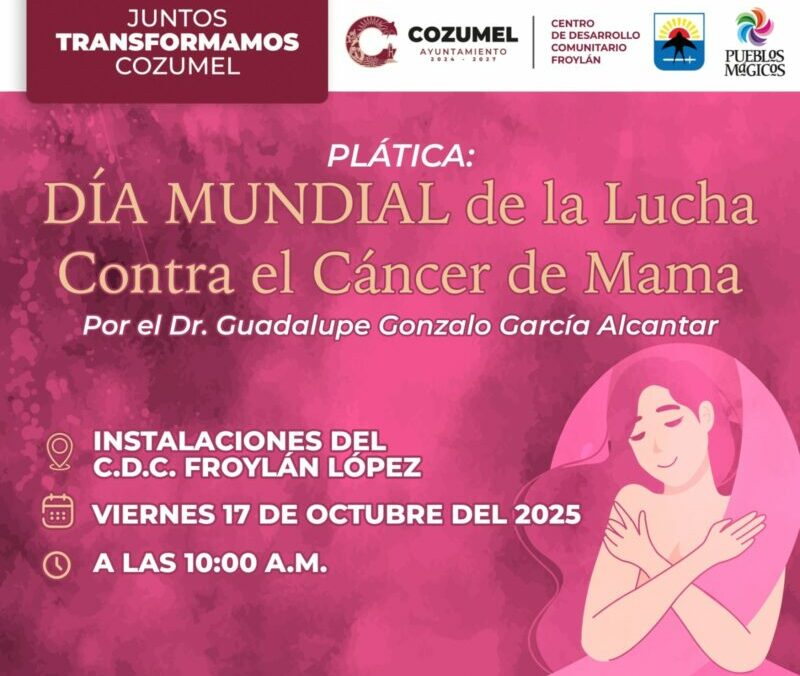 Cozumel. – Como parte de las actividades por el mes de octubre, el Gobierno Municipal que encabeza el presidente, José Luis Chacón Méndez, invitó a la población en general, mujeres y hombres, a participar en la plática informativa y preventiva “Día Mundial de la Lucha Contra el Cáncer de Mama” que se llevará a cabo el próximo viernes 17 de octubre en el Centro de Desarrollo Comunitario (CDC) Froylán López, ubicado a un costado de la unidad deportiva Bicentenario.