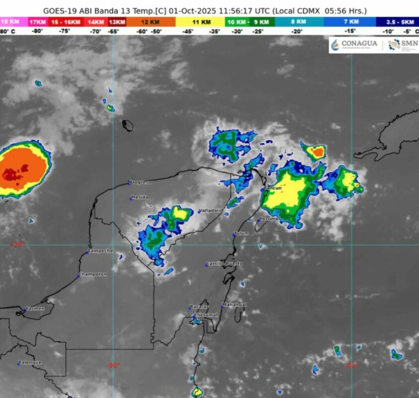 Cielo medio nublado a nublado en el transcurso del día, con lluvias puntuales muy fuertes en Campeche, Yucatán y Quintana Roo; acompañadas con descargas eléctricas; además, podrían originar inundaciones, encharcamientos y visibilidad reducida.