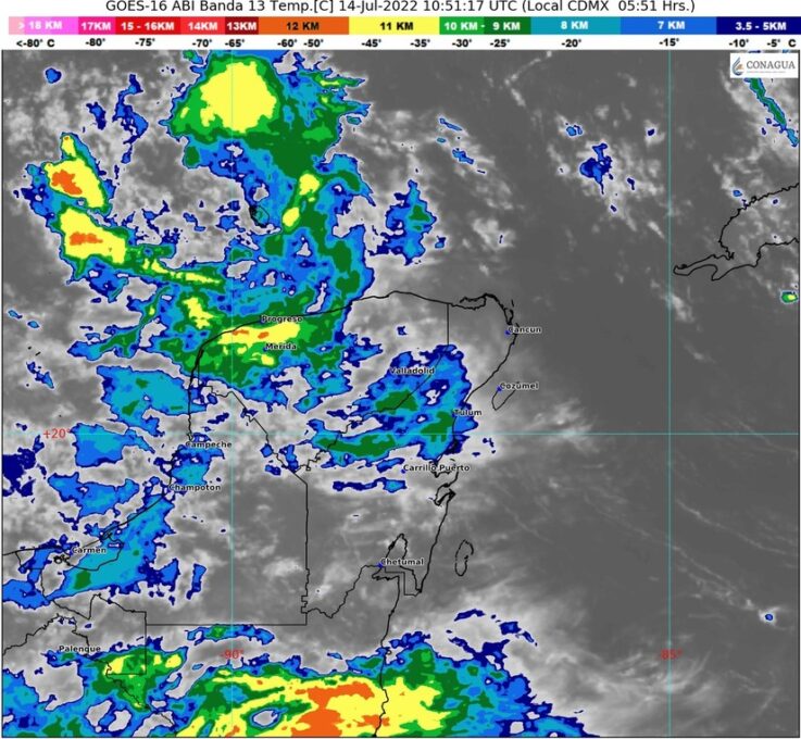 1.- Se mantiene la entrada de aire marítimo tropical con variable contenido de humedad procedente del Golfo de México y mar Caribe hacia la Península de Yucatán; favorece la permanencia de temperaturas muy calurosas a bochornosas durante el día y parte de la noche, cielo medio nublado a nublado; se registrarán lluvias dispersas con chubascos aislados acompañados de actividad eléctrica ocasional sobre algunas zonas del Estado de Quintana Roo, más frecuentes por la tarde o noche.