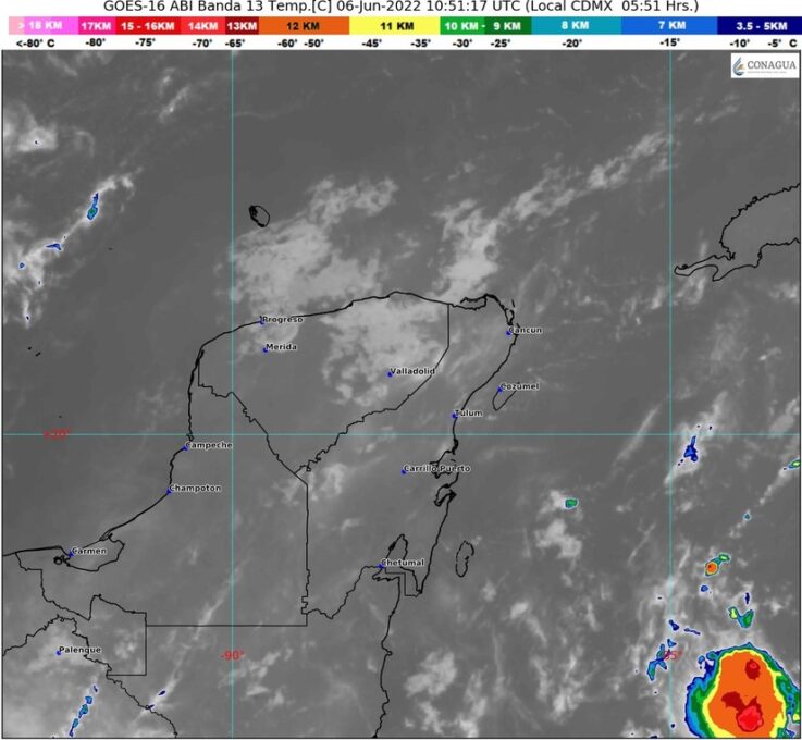 1.- Continua la vaguada térmica (canal de baja presión) localizada en superficie sobre la porción central de la Península de Yucatán; sin movimiento aparente; en su amplia circulación periférica está impulsando aire marítimo tropical con variable contenido de humedad del Golfo de México y mar Caribe hacia la región peninsular; mantiene cielo medio nublado a nublado; se registraran lluvias dispersas con chubascos acompañados de actividad eléctrica aislada sobre algunas zonas del estado de Quintana Roo, más frecuentes por la tarde o noche.